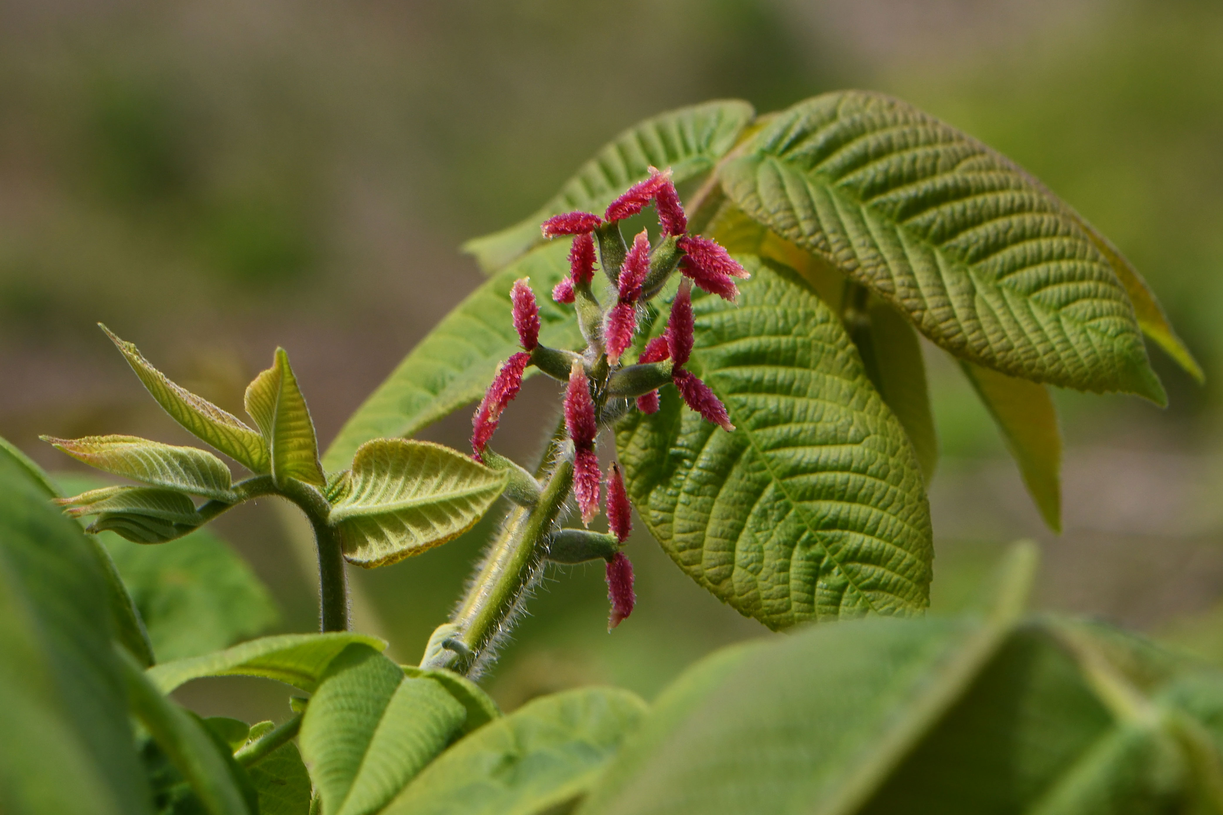 花期は5 – 6月ごろ、風媒花で雌雄同株。雌花は新枝の先に10個ほど穂になって咲き、雌蕊は真っ赤で二股である。 雄花は前年の枝に多数房となって垂れ下がる。